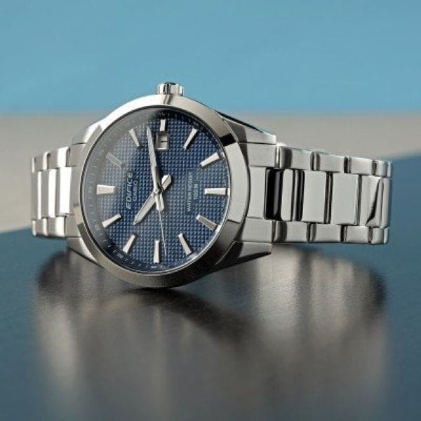 Il quadrante dell’EFV-160D presenta un layout a tre lancette con datario, arricchito dalla texture sofisticata a rilievo della trama Clous de Paris, a motivo piramidale. Cassa da 40 mm in acciaio inox e un nuovo design del bracciale, questo orologio garantisce una vestibilità naturale e confortevole per tutto il giorno. Il vetro leggermente curvo migliora la leggibilità, mentre la resistenza all’acqua fino a 10.