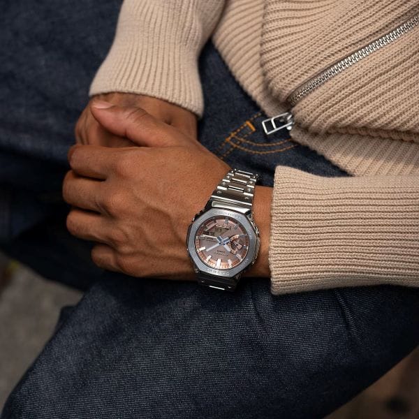La collezione G-SHOCK 2100 continua ad evolversi. Nasce GM-B2100AD-5AER, il nuovo arrivato full metal con connessione Bluetooth®. Design essenziale e minimal, con cassa ottagonale in acciaio, bracciale in acciaio, fondello con chiusura a vite e profilo sottile che però riesce a mantenere l’indistruttibilità di ogni G-SHOCK. Dotato di utili caratteristiche tecniche quali connessione allo smartphone tramite Bluetooth®, Tough Solar, luce LED ad alta luminosità.