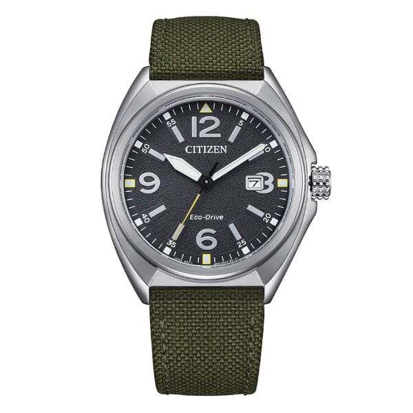 Citizen Urban Eco Drive AW1571-09E. Orologio con cassa in acciaio, diametro di 42,00 mm. Cinturino in cordura verde con chiusura ad ardiglione. Resistenza all’acqua di 10 atm. Orologio con quadrante verde, vetro minerale. Eco drive con riserva di carica di 8 mesi.