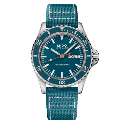 Mido rende omaggio alla collezione Ocean Star. Ispirandosi al passato, l’Ocean Star Tribute reinterpreta i codici estetici dei modelli da immersione degli anni Sessanta del Novecento e ne riprende tutti i segni particolari: è dotato di un movimento automatico Calibro 80 fino a 80 ore di riserva di carica, impermeabile fino a una pressione di 20 bar (200 metri), e il suo bracciale esclusivo conferisce all’orologio un confort assoluto.