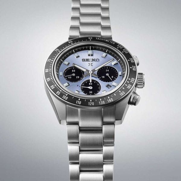 La lancetta dei secondi del cronografo si estende fino alle indicazioni tachimetriche sul bordo del quadrante. Il segnatempo è alimentato dal calibro solare V192 di Seiko che offre un cronografo di 60 minuti, un quadrante secondario di 24 ore e, quando è completamente carico, funziona fino a sei mesi senza esposizione alla luce.