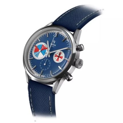 Progettato e sviluppato in collaborazione con l’aeronautica militare francese, il Flygraf Bi-Compax French Air Force è dotato del calibro ibrido VK61 di Seiko con cronografo bicompax verticale e logo Yema e Aeronautica Francese stampati sul quadrante.