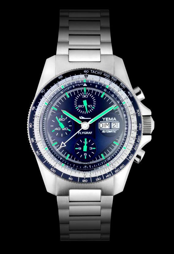 Ispirato all’iconico modello YEMA degli anni ’70 e dotato di un calibro svizzero Valjoux 7750 calibro cronografo svizzero. Rinomato per la sua precisione e affidabilità, ha ore, minuti, secondi e un meccanismo di carica automatica con cuscinetti a sfera. Con 25 rubini, frequenza a 28.800 A/h e con una riserva di carica di 48 ore. Dotato di una lunetta multifunzione con regole di calcolo dell’aviazione.